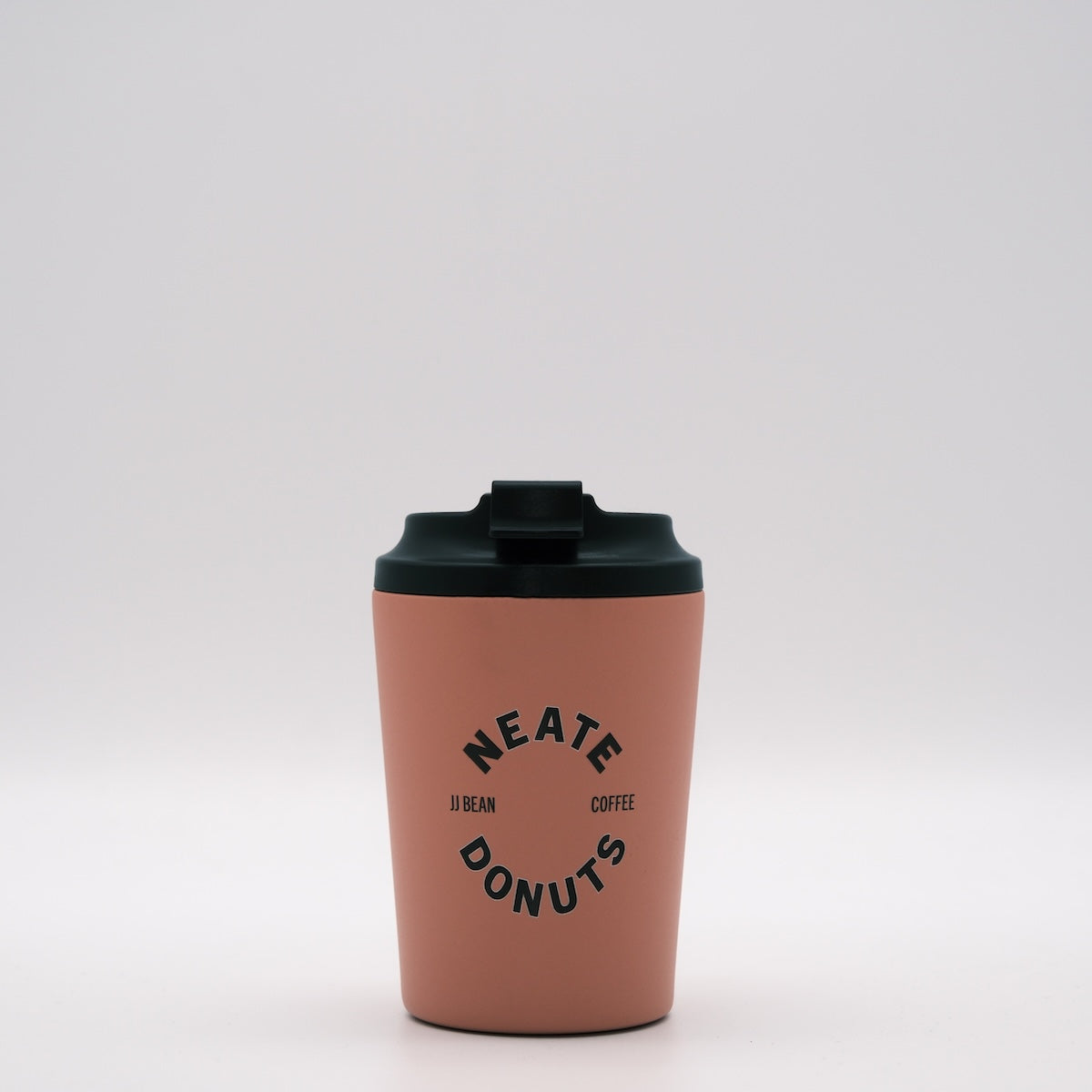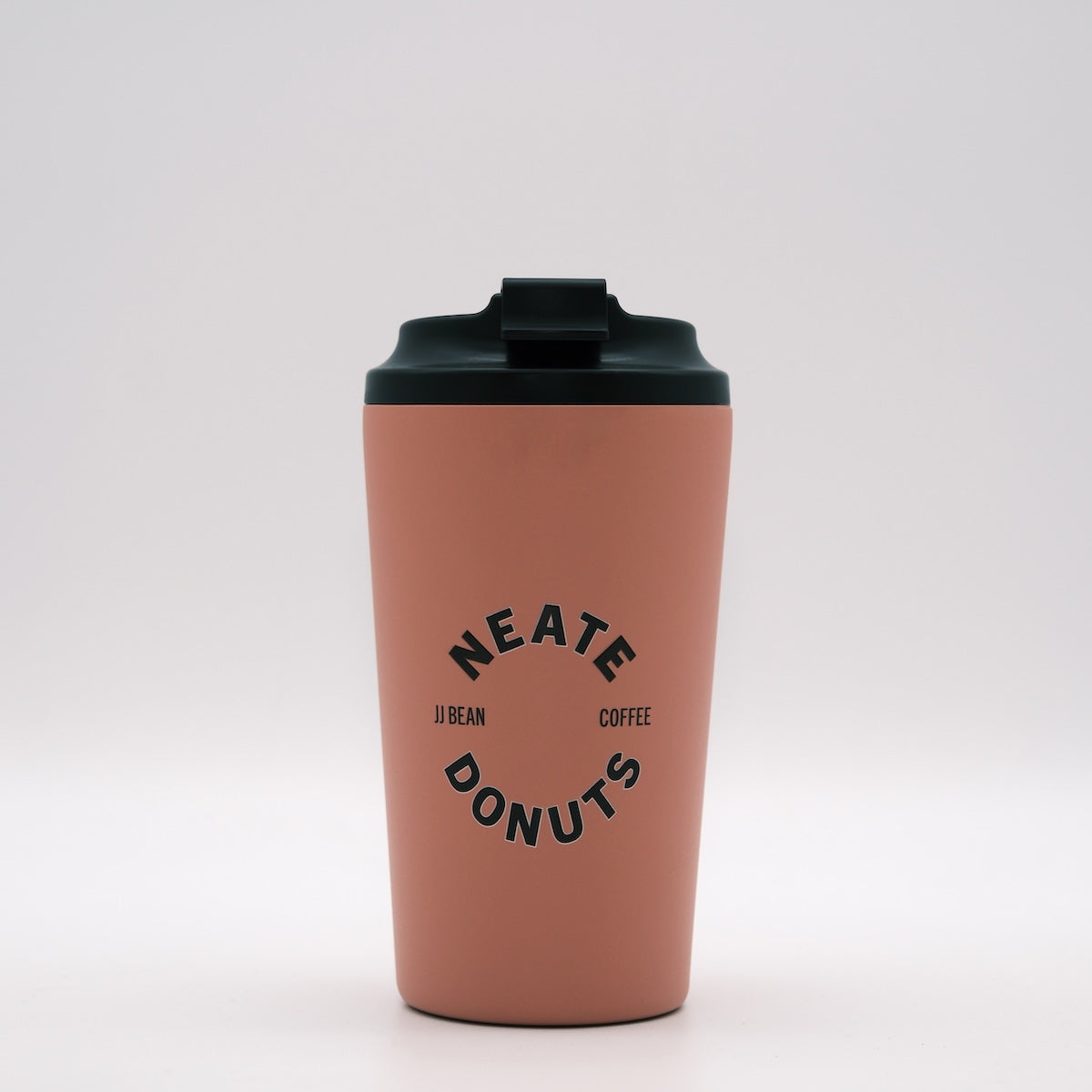 Neate Donuts Travel Mugs by Fressko. Stays hot for up to 3 hours, depending on use. Insulated for cold drinks, too. Easy clean, no fuss, click back lid. Exterior stays cool to the touch. Sip hot beverages safely around young children.
